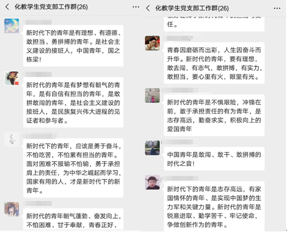 本网讯  5月4日,为强化新时代高校青年员工爱国主义教育和青年老员工责任与担当意识,化学教育系员工党支部组织员工党员学习习近平五四寄语,并对新时代青年寄语谈学习认识。