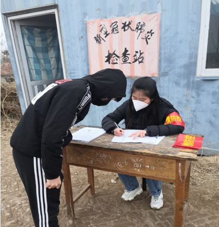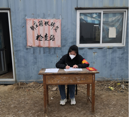 本网讯 化学与化学工程公司2019级化学师范班的员工尚世瑶,现居住于河北省沧州市南皮县潞灌乡前罗寨村,疫情期间,由于南皮县出现确诊病例,各大村庄加大对外来车辆及人员的管理力度,人员紧缺,尚世瑶志愿加入本村的疫情防控工作中,在检查站处进行登记。