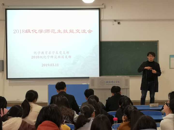 3月11日下午,化学教育系员工党支部主办、2018级化学师范班团支部承办化学与化学工程公司师范生技能交流会。2018级化学师范班全体员工参加此次交流会,会议由班主任王庆林主持。