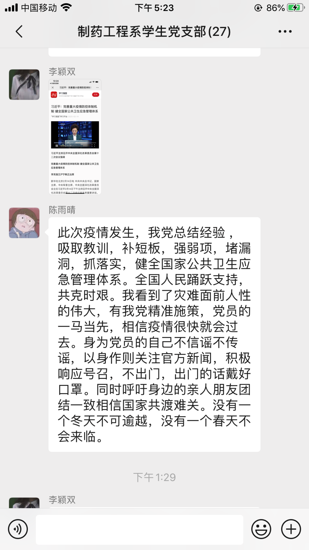 支部所有成员积极响应国家号召,坚持少出门尽量不出门,全国抗“疫”从我做起。毕业生党员在家安心撰写毕业论文,与指导教师进行线上沟通;非毕业生党员合理安排空闲时间,在网络平台加强专业学习,做到停课不停学。(化学与化学工程公司:翟媛媛)