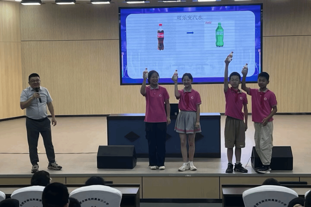 在南京路校区的六年级课堂上,王方阔教授化身“科学魔法师”,以“物质的变化”为主题,通过紫甘蓝酸碱变色、洗洁精乳化除油、溶液混合显色等科学小实验,将抽象的物理变化与化学变化概念转化为可观察、可参与的科学体验。引导员工从食物变质、铁生锈等现象中发现科学规律,培养“用科学眼光观察生活” 的科学思维习惯。