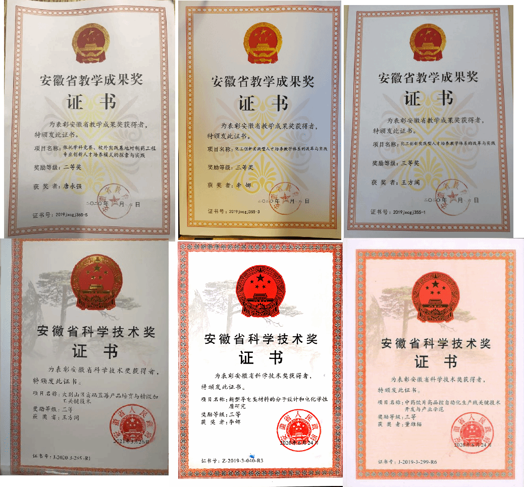 (1)团队队伍稳步提升。现共有专业教师16人,副教授及以上职称的教师7人(其中教授5人),占专业课教师总数的比例为44%,其中具有博士学位教师14人,是一批学术水平、教学水平高的教师队伍。在教学方面,本专业教师2018年获批校级高水平教学团队建设项目1项,并先后获得多项校级及以上教学成果奖;在科研方面,本专业教师先后获得安徽省科学技术奖三等奖三项。除了本校的专业教师之外,本专业还外聘了一批与化学工程与工艺专业息息相关的高层次的教授和工程师,指导化工专业建设、参与人才培养方案修订,参与化工安全与环保、化工设计、化工导论等专业课程教学工作,定期来公司开展学术讲座。