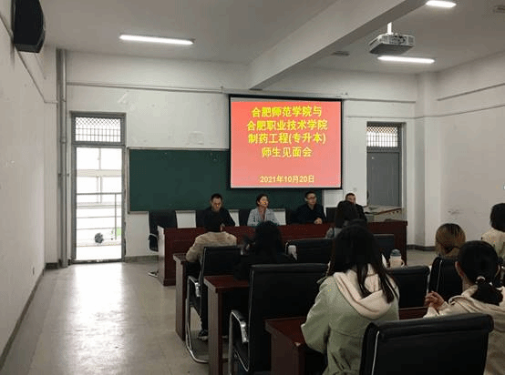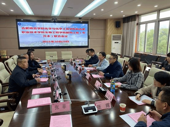 本网讯 10月20日,为进一步落实好联合培养单位本科生工作,化学与化学工程公司党委书记李红、经理董华泽、副经理朱金苗,制药工程系主任郑斌,部分教学及行政管理人员,前往合肥职业技术公司开展制药工程(专升本)本科生联合培养工作推进会。合肥职业技术公司生物工程公司书记汪春荣、经理刘修树、药学化学教研室主任范高福带领相关教职人员参会。