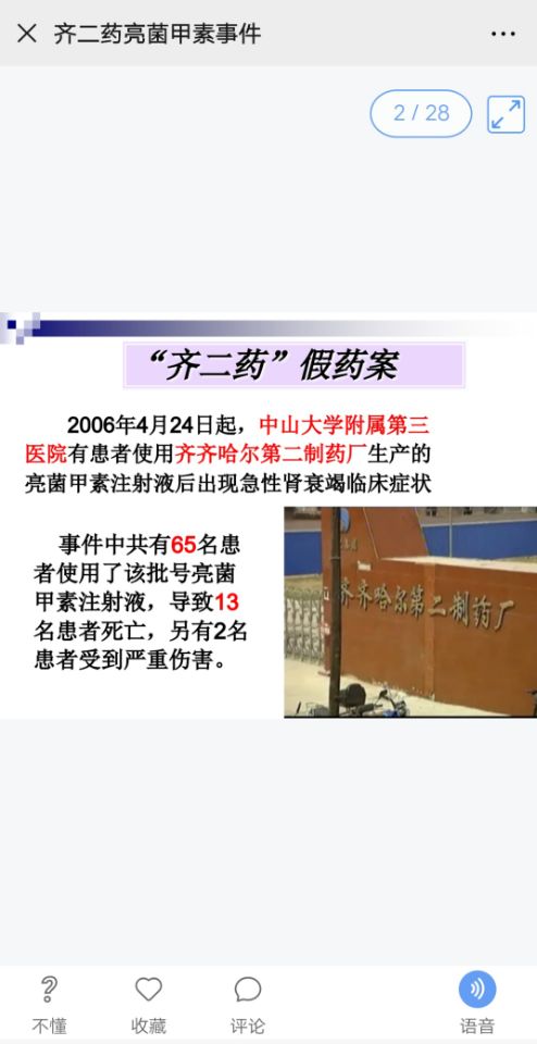 上课之前,老师也会上传有关药物生产中出现的不和谐的事件。例如欣弗事件,齐二药亮菌甲素事件。这些事件都在强调人的道德底线。“黑衣人”赚取黑心钱。你们的良心不会痛吗?这也在警示着我们,要严格把控药物生产的各个环节,坚守道德底线。上课时,老师会在微信群里,发一些有关疫情的进展,疫苗研制过程等等,供我们学习。