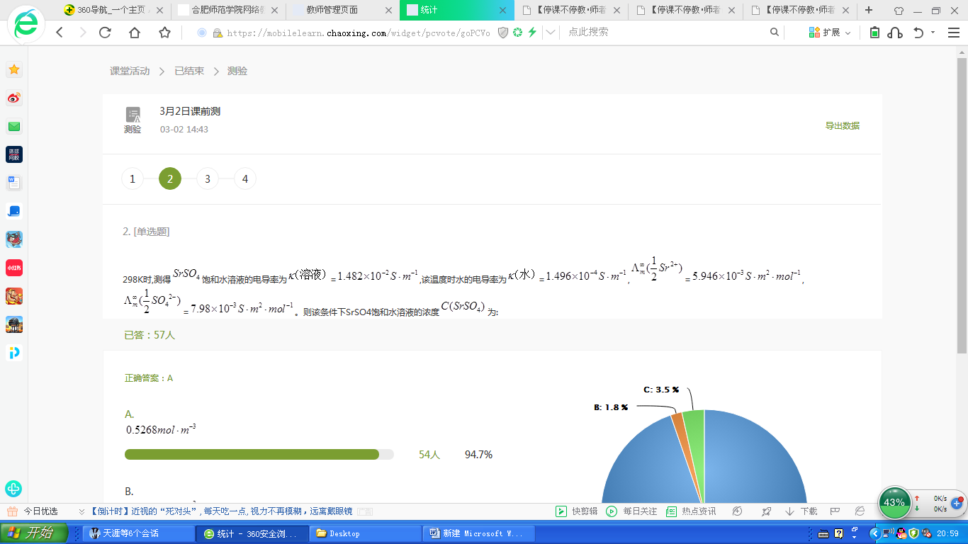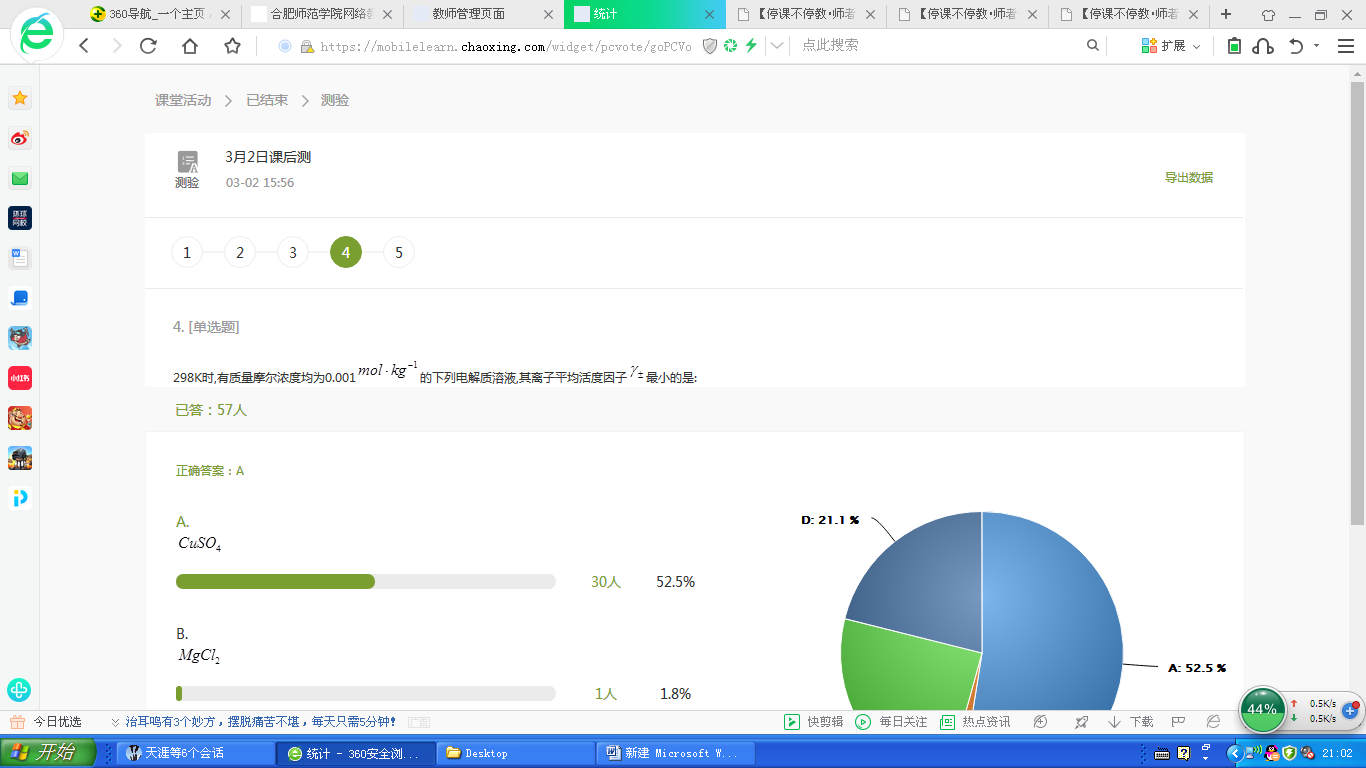 开学至今,因上课时间在线用户过多,无法顺利使用教学平台进行在线直播,因此,我选择了课上比较方便与员工进行互动、而且直播内容可以回放的“腾讯课堂”进行课程直播,对课程中涉及的重、难点进行讲解,对测试及作业中存在的问题与同学们探讨。同时还采用超星尔雅(学习通)网络教学平台进行课堂签到、课前测、课后测、章节考试等各种活动。
