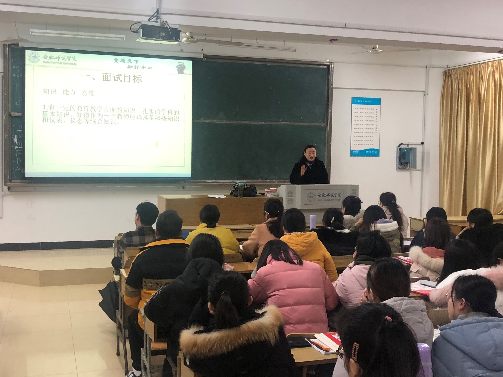 合肥65中学副董事长、化学特级教师江乐宵老师为2016级化学(师范)班进行《中学化学教团队格考试标准与教师招聘专题解读》的课程讲授。江老师是合肥市教师招聘考试和教团队格证考试的面试考官,拥有非常丰富的面试经验。在授课过程中邀请了中学一线年轻教师与同学们进行同课异构教学,同学们受益匪浅。