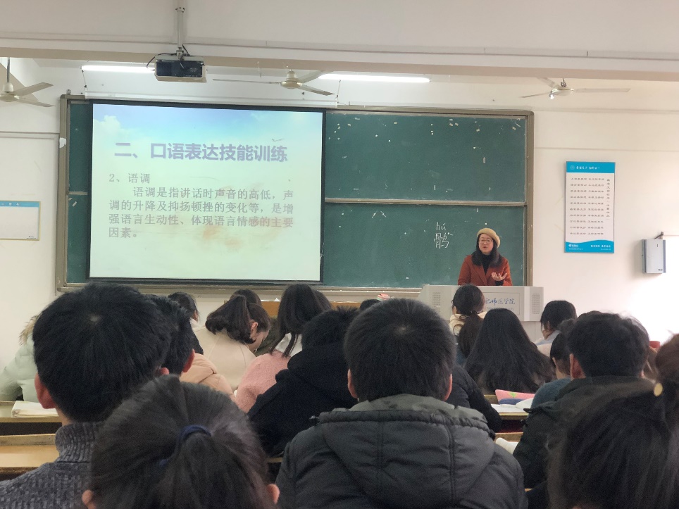 太阳成集团122ccvip附属小学语文高级教师郑收老师为2017级化学(师范)班讲授《教师口语与教师礼仪》,郑老师多次参加国家级、省级以上教学比赛并获奖,对教师口语与教师礼仪课程理解深刻,讲授专业,上课生动,课堂气氛热烈,获得了很好的教学效果。