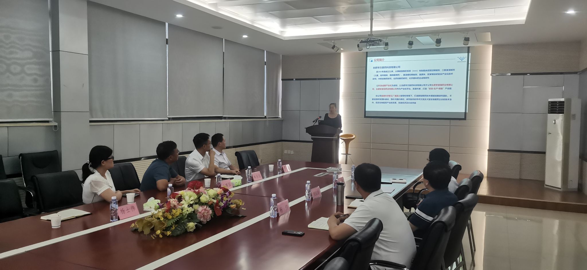 会上,吴宗好董事长代表合肥华方医药对公司一行的到来表示热烈欢迎,他首先介绍了公司的发展历史、主营业务、核心产品和公司规模等基本情况,行政总监戴红介绍了公司科研平台和荣誉资质等,副总经理何勇介绍了近年来企业与高校合作的基本情况、产品结构、核心技术和科技奖申报等。