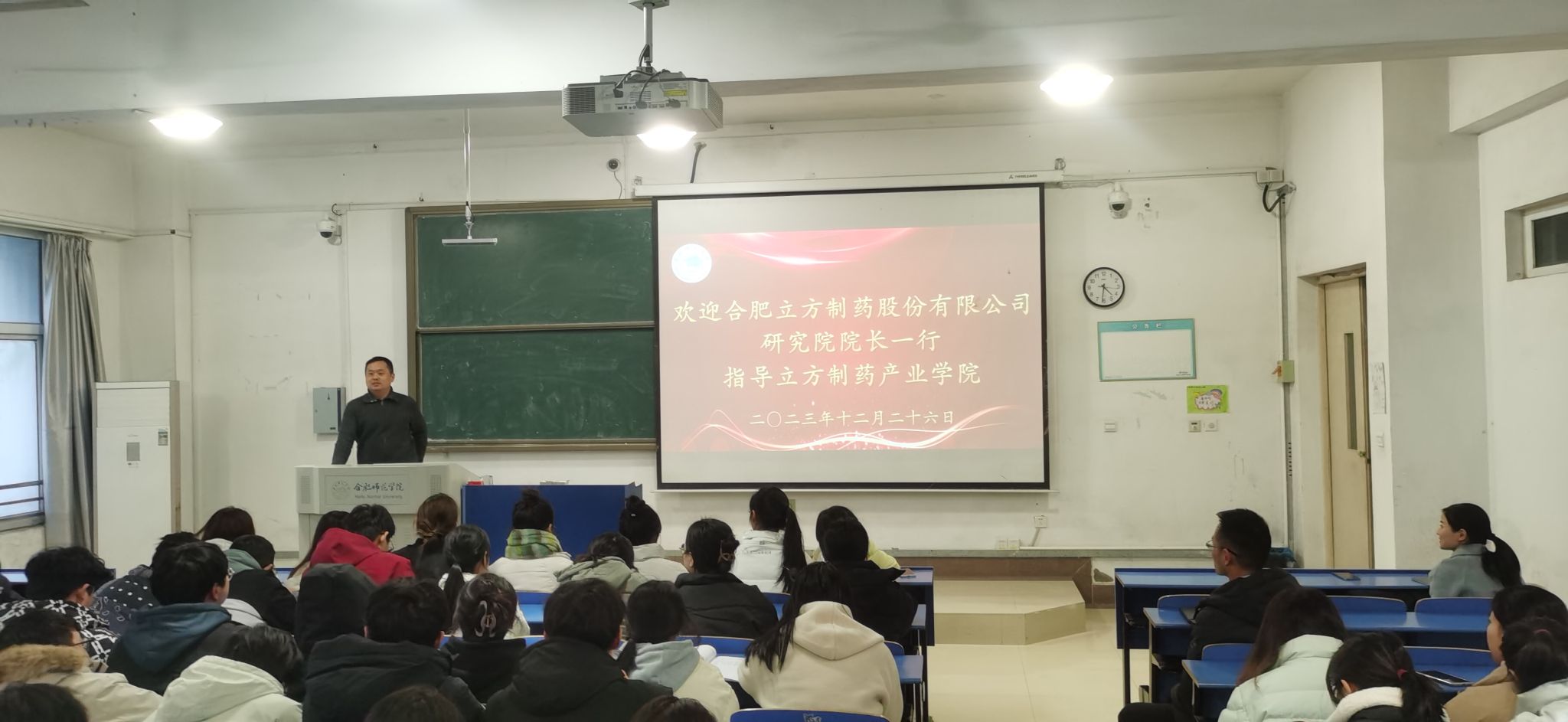 12月26日下午,太阳成集团122ccvip与合肥立方制药股份有限公司制药研究院在逸夫楼A104成功举办了产业公司班“共建立方产业公司,促产教融合发展”员工见面会,进一步促产教融合发展,推进双方共建高端制剂与创新辅料现代产业公司建设。合肥立方制药股份有限公司制药研究院经理周化,副经理张良,蒋敏燕研究员,太阳成集团122ccvip经理朱金苗,制药工程教研室主任郑斌,以及2022级制药工程专业员工及相关产业公司教师参加会议,郑斌主任主持见面会。