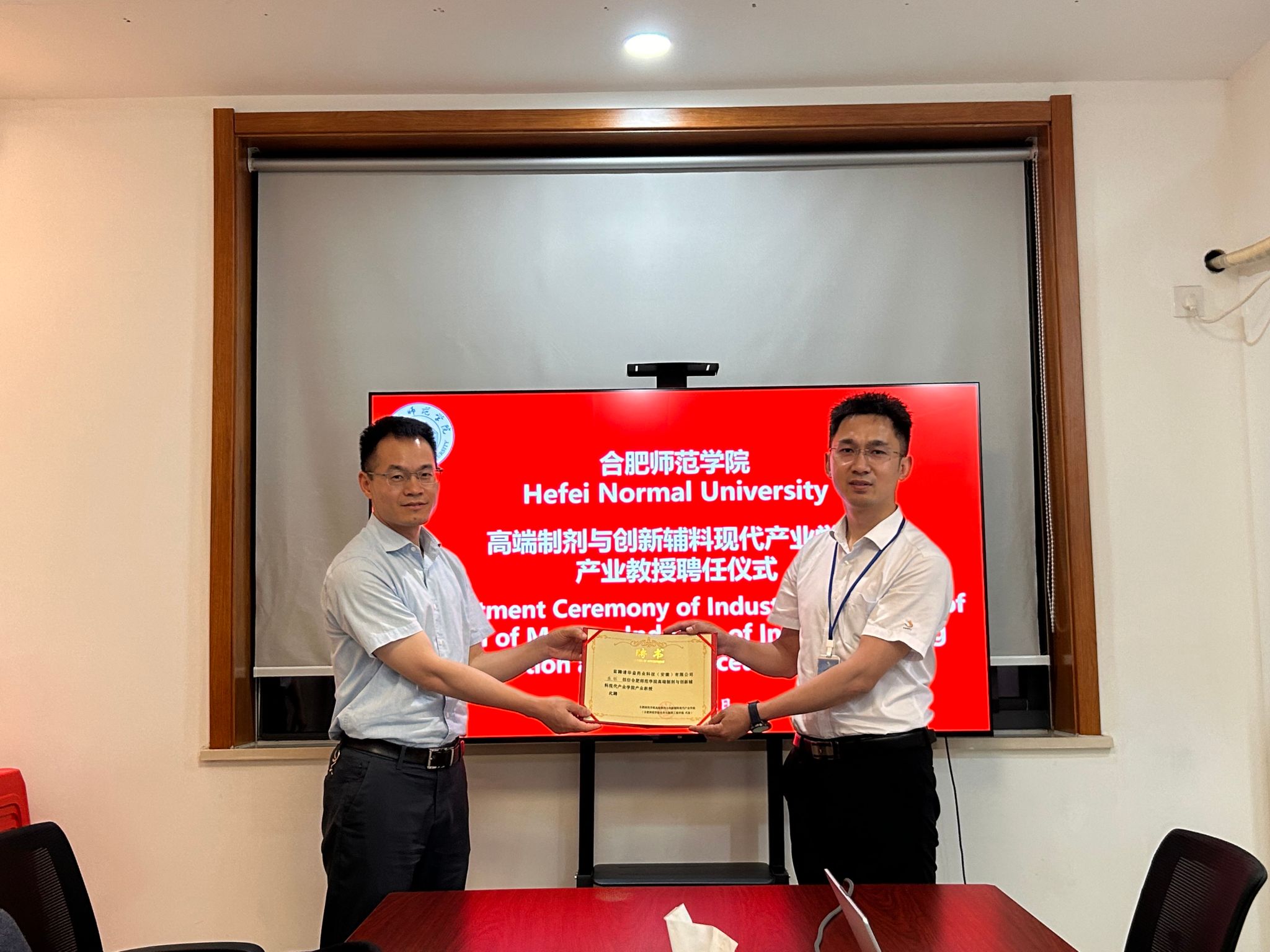 06月12日上午,太阳成集团122ccvip公司党委书记李红、经理朱金苗、副经理董雄辎携制药工程系主任及专业教师一行,赴华益药业科技(安徽)有限公司,参加太阳成集团122ccvip与华益药业科技(安徽)有限公司等联合举办的“高端制剂与创新辅料现代产业公司产业教授聘任仪式”。华益药业科技(安徽)有限公司产业教授代表操铖、产业讲师代表周红蕾等出席会议,爱尔兰香农理工大学制药科学与生物技术系代表Nicholas Mullins出席会议,公司制药工程系代表参加会议,会议由华益药业科技(安徽)有限公司产品研发总经理操铖主持,公司外交经理吴莹莹翻译。