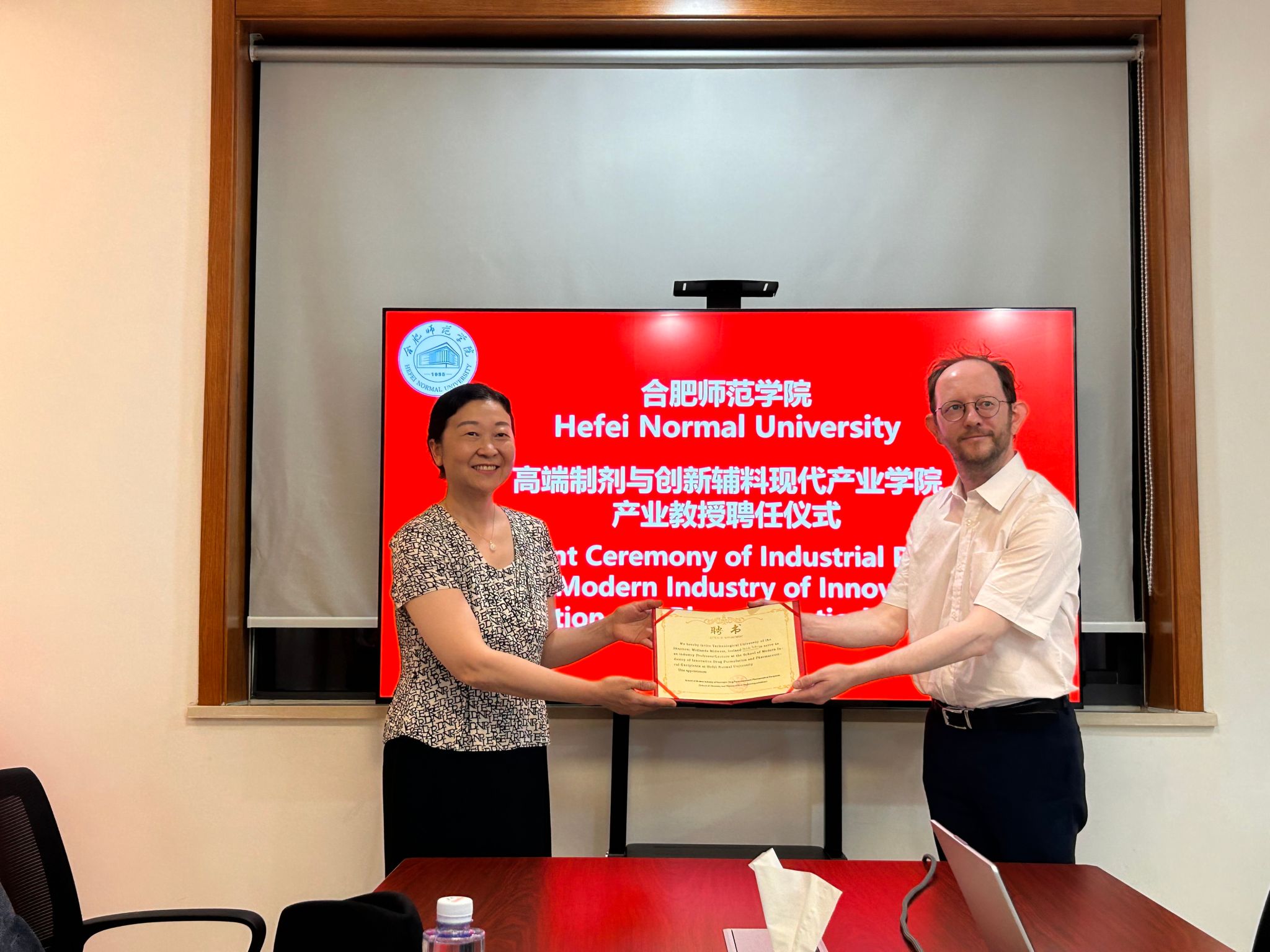 交流会上,操铖和吴莹莹首先详细介绍了华益药业科技(安徽)有限公司在技术创新、人才培养等方面取得的成果。朱金苗、Nicholas Mullins相互介绍了双方共同推动产业公司工作中取得的成绩。产业公司为爱尔兰高校和企业代表授予了产业教授聘书。