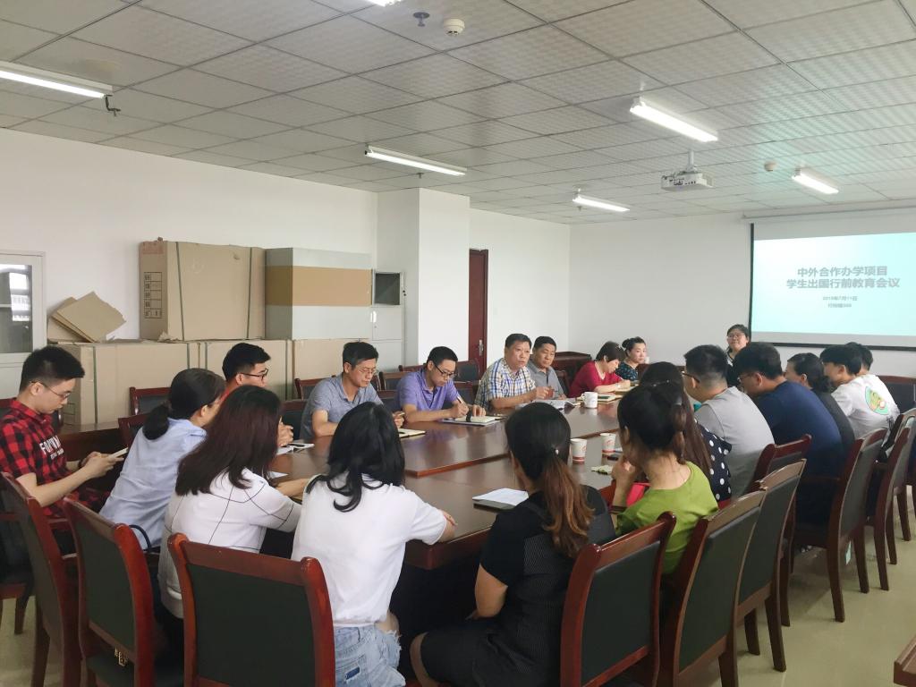 本网讯 7月11日下午,国际交流与合作处在行知楼308会议室举行了2019年中外合作办学项目员工出国留学行前教育会。国际交流与合作处处长张宇翔教授、经济与管理公司党总支书记沈辉老师、教师教育公司经理李群教授、化学与化学工程公司经理董华泽教授、生命科学公司经理徐忠东教授出席会议,中外合作办学项目员工及家长等参加了会议。会议由张宇翔主持。