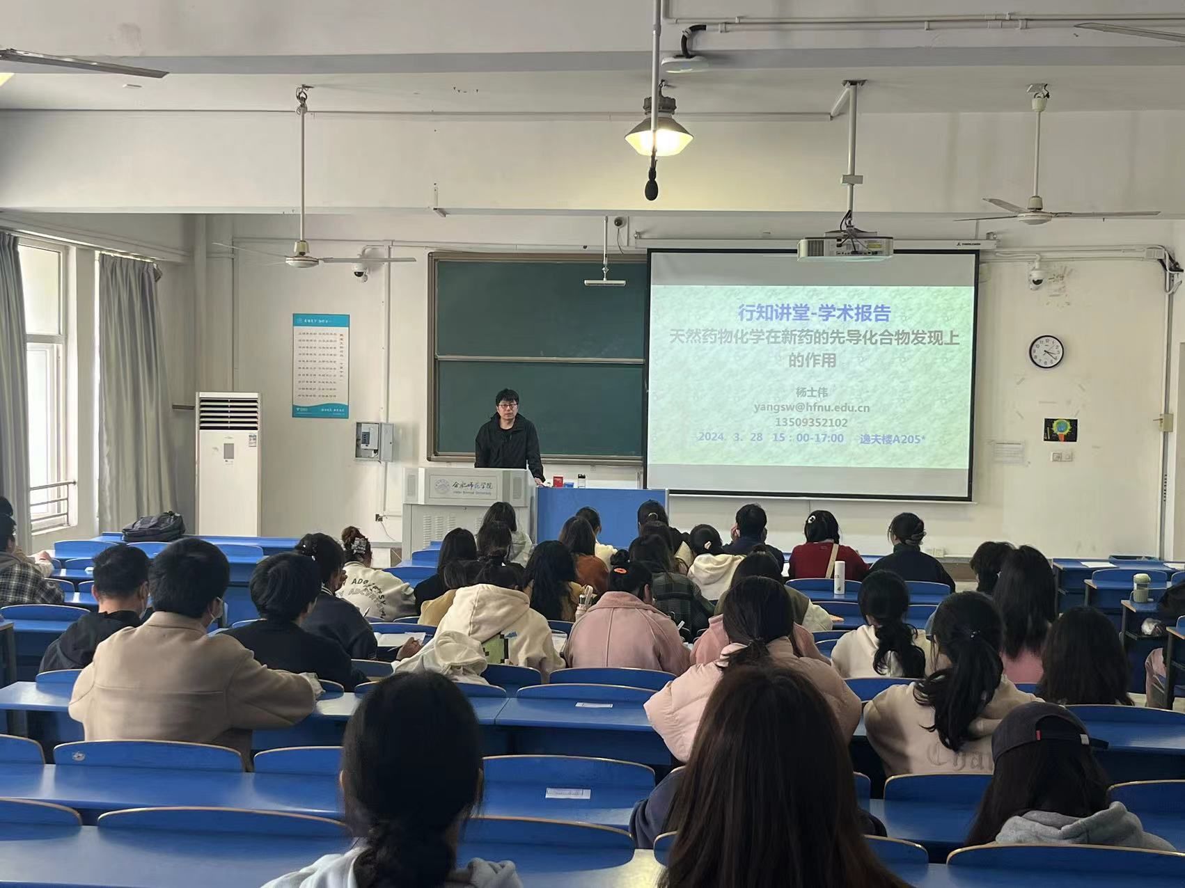 3月28日下午,太阳成集团122ccvip杨士伟老师在锦绣校区逸夫楼A205教室做了题为“天然药物化学在新药的先导化合物发现上的作用”的学术报告,20级制药工程,22级制药工程,23级制药工程等专业的100多名员工参加了报告会。