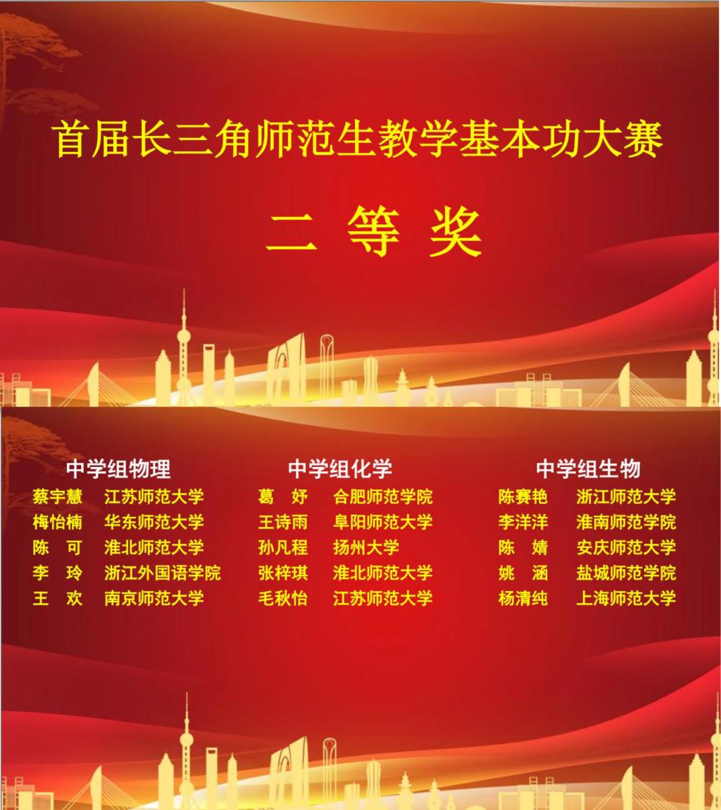 本次大赛充分发挥长三角高校在实施卓越教师培养中的引领和示范作用,旨在培养造就一批教育情怀深厚、专业基础扎实、勇于创新教学、善于综合育人和具有终身学习发展能力的高素质专业化新型基础教育团队。不仅为师范生提供了一个展示能力、互相学习交流的机会,也为各高校同仁提供了一个学术交流、增进友谊的平台。(化学与化学工程公司:王骏 姚娟娟)