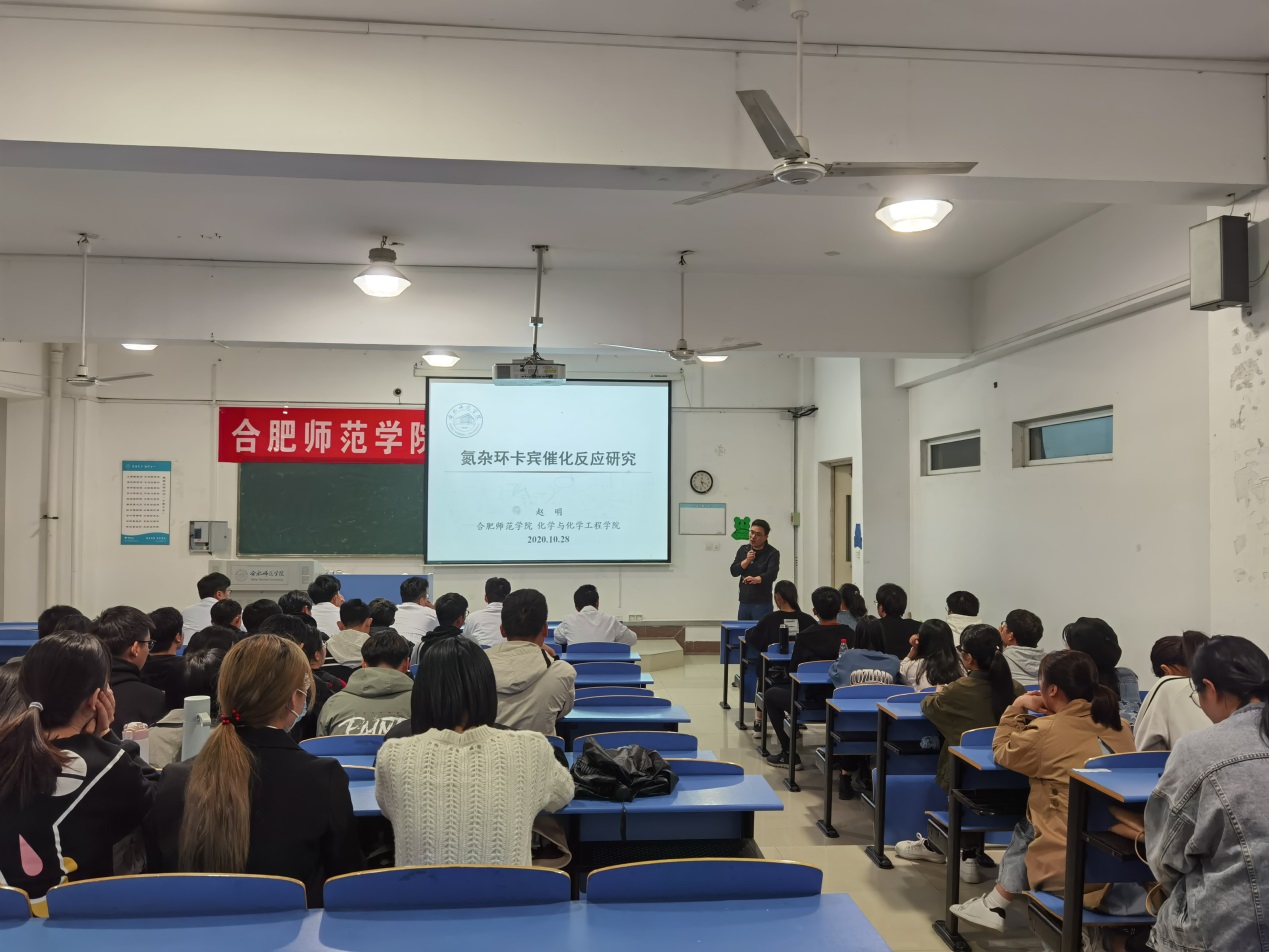 本网讯 10月28日下午,“行知讲堂”学术报告在锦绣校区逸夫楼A209教室举行。本场报告由化学与化学工程公司赵明博士主讲,主题为“氮杂环卡宾催化反应研究”,药物制剂专业员工聆听了学术报告,报告由药物制剂系主任陈虎副教授主持。