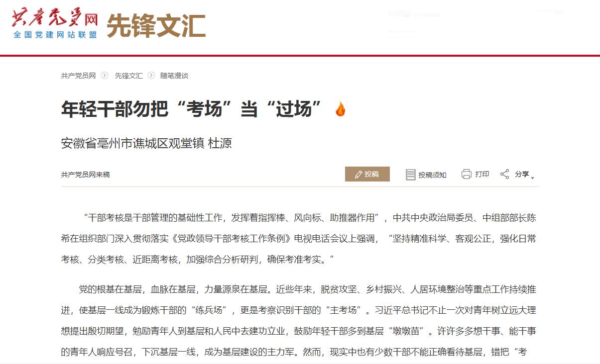 本网讯 共产党员先锋文汇网刊发公司制药工程专业2019届毕业生杜源撰写文章:年轻干部勿把“考场”当“过场”。全文主要突出党的根基在基层,血脉在基层,力量源泉在基层。年轻干部要做好基层工作,强化基层工作经验,发挥基层工作力量,切切实实耕耘好基层这片沃土,为全面打赢脱贫攻坚战、振兴美好乡村建设,书写出青春美好华章。(化学与化学工程公司:王庆林)