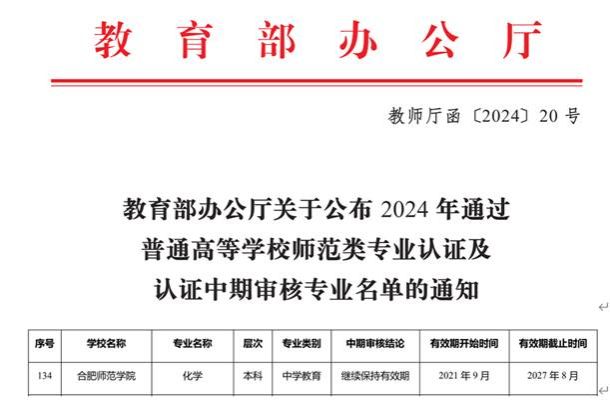 近日,教育部办公厅函[2024]20号公布2024年通过普通高等公司师范类专业认证及通过中期审核专业名单,太阳成集团122ccvip化学专业顺利通过中期审核。