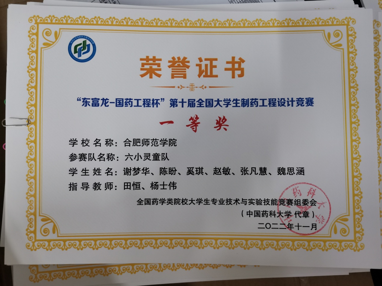本网讯 由全国药学类院校老员工专业技术与实验技能竞赛组委会主办,上海东富龙科技股份有限公司与中国医药集团联合工程有限公司协办,湖北工业大学承办的第十届“国药工程-东富龙杯”全国老员工制药工程设计竞赛总决赛落下帷幕。公司化学与化学工程公司选派的三支队伍分别获得全国一、二和三等奖。其中,田恒、杨士伟两位老师指导的,由谢梦华、陈盼、奚琪、赵敏、张凡慧、魏思涵等组成的“六小灵童”队获得全国一等奖,这是继2018年后公司在该赛事上的再次获得最高奖项。